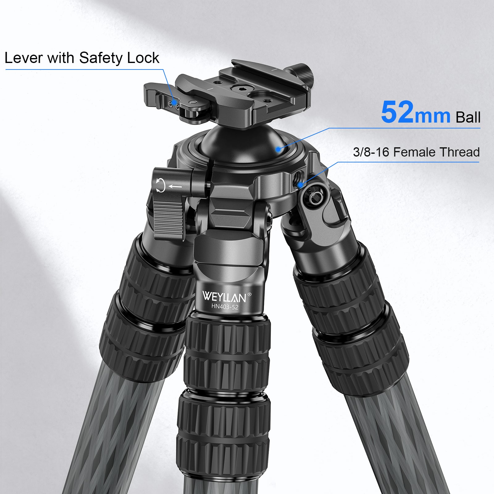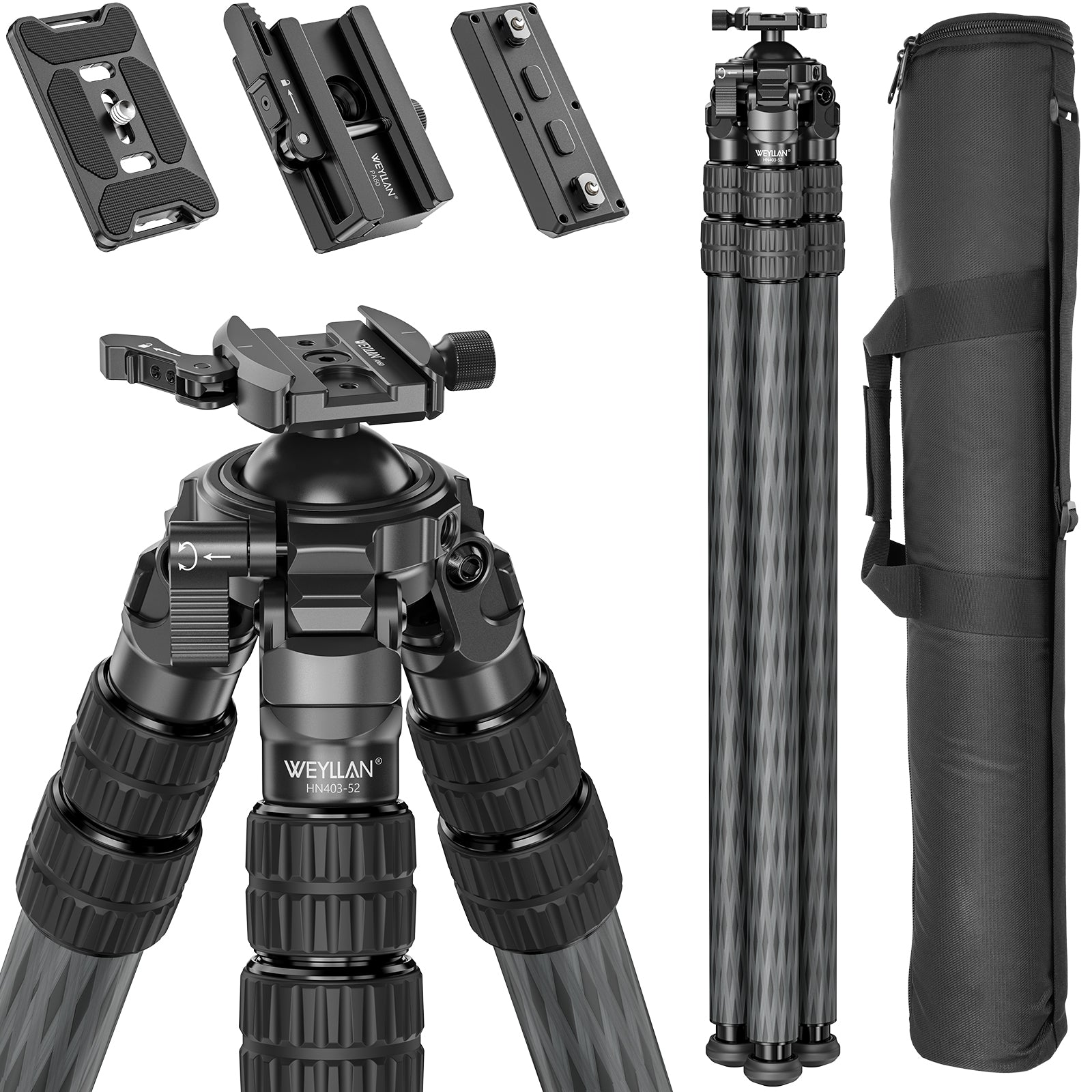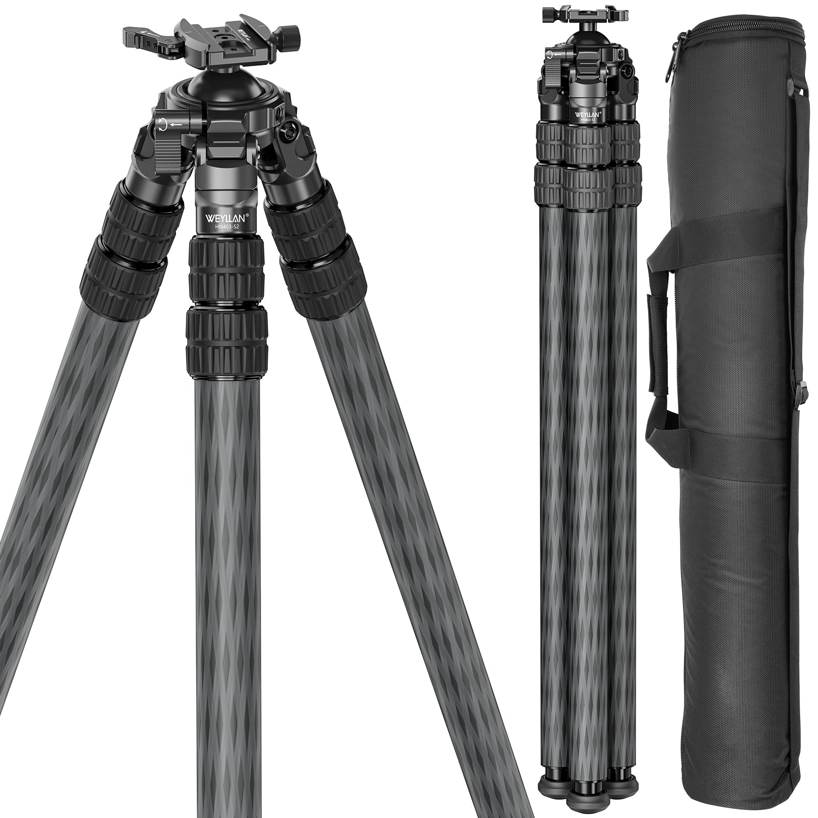 · WEYLLAN HN403 carbon fiber shooting tripod is integrally molded with 52mm lever ball head, net weight is only 5.1lbs/2.3kg and comes with carrying bag, lightweight and easy to carry, making wilderness hunting more convenient